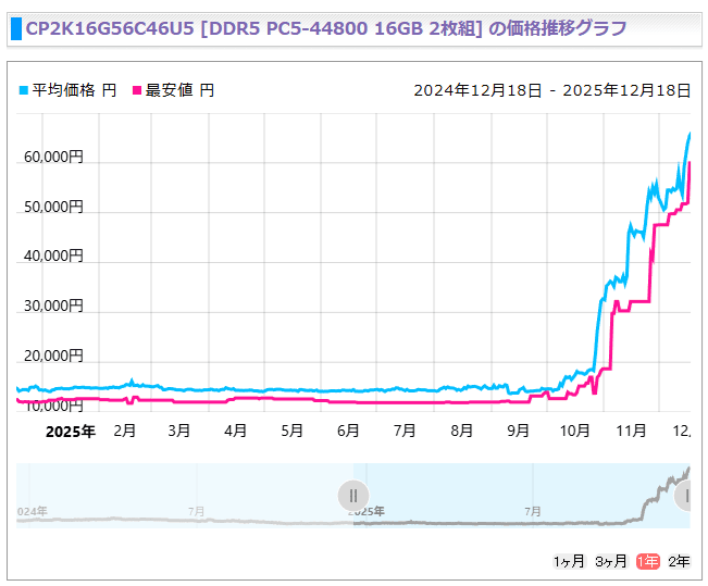 2025年9月頃にはおおよそ1.1万円~1.3万円ほどだったものが、2025年12月現在では5~6万円になっており、なんと4~5倍程度の高騰を見せています。